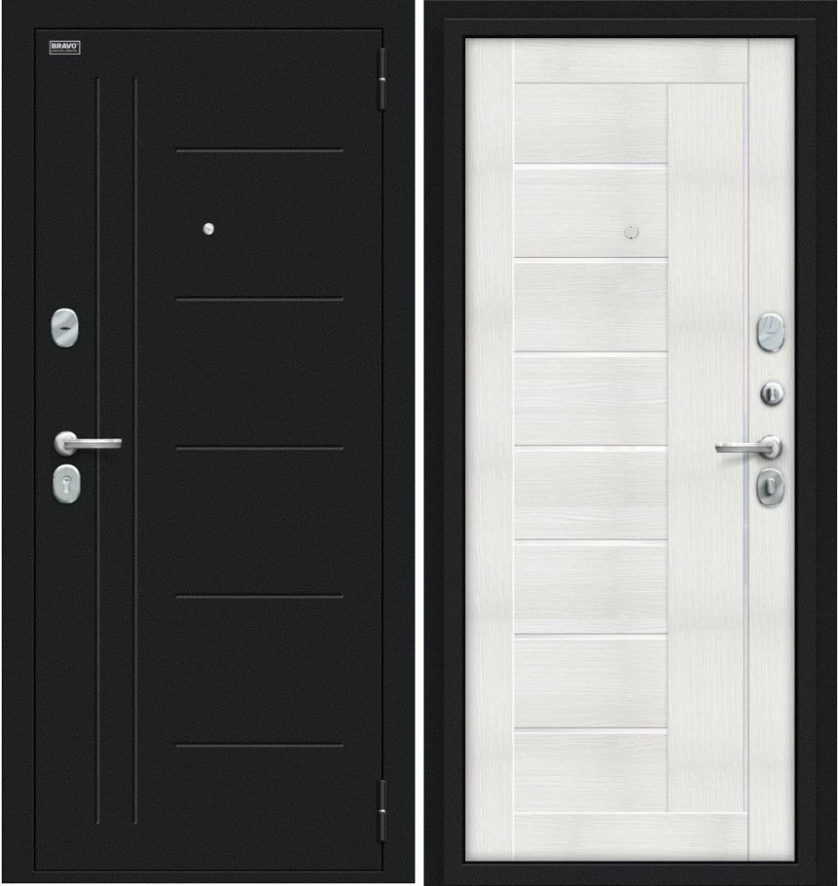Надежная входная Дверь Браво Проф Букле черное/Bianco Veralinga премиум класса по цене 32 469 руб. Большая толщина стали защитит от проникновения в ваш дом, квартиру или коттедж. Используется очень качественная фурнитура: замки, цилиндры, ручки, защелки. Покрытие и отделка двери изготовлено под внимательным контролем производителя. Дверь имеет долгий срок службы и гарантию.