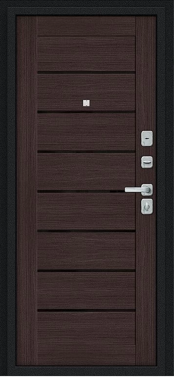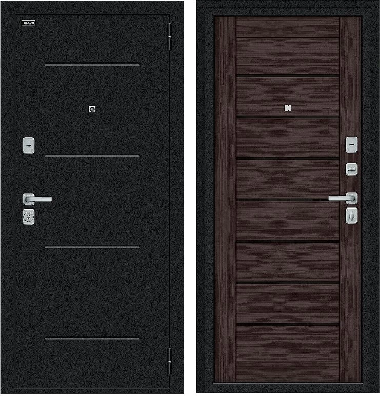 Надежная входная Дверь Браво Техно/BChrome Букле черное/Wenge Melinga премиум класса по цене 34 519 руб. Большая толщина стали защитит от проникновения в ваш дом, квартиру или коттедж. Используется очень качественная фурнитура: замки, цилиндры, ручки, защелки. Покрытие и отделка двери изготовлено под внимательным контролем производителя. Дверь имеет долгий срок службы и гарантию.