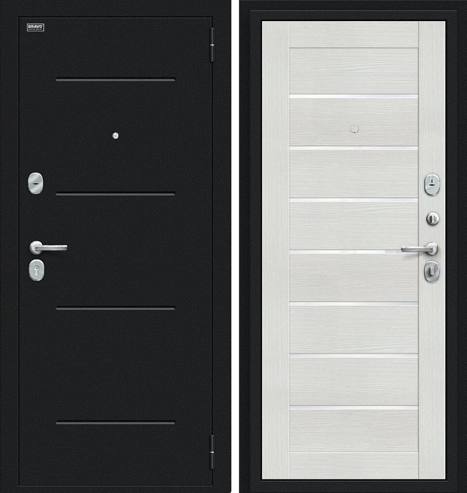 Надежная входная Дверь Браво Техно Букле черное/Bianco Veralinga премиум класса по цене 30 869 руб. Большая толщина стали защитит от проникновения в ваш дом, квартиру или коттедж. Используется очень качественная фурнитура: замки, цилиндры, ручки, защелки. Покрытие и отделка двери изготовлено под внимательным контролем производителя. Дверь имеет долгий срок службы и гарантию.
